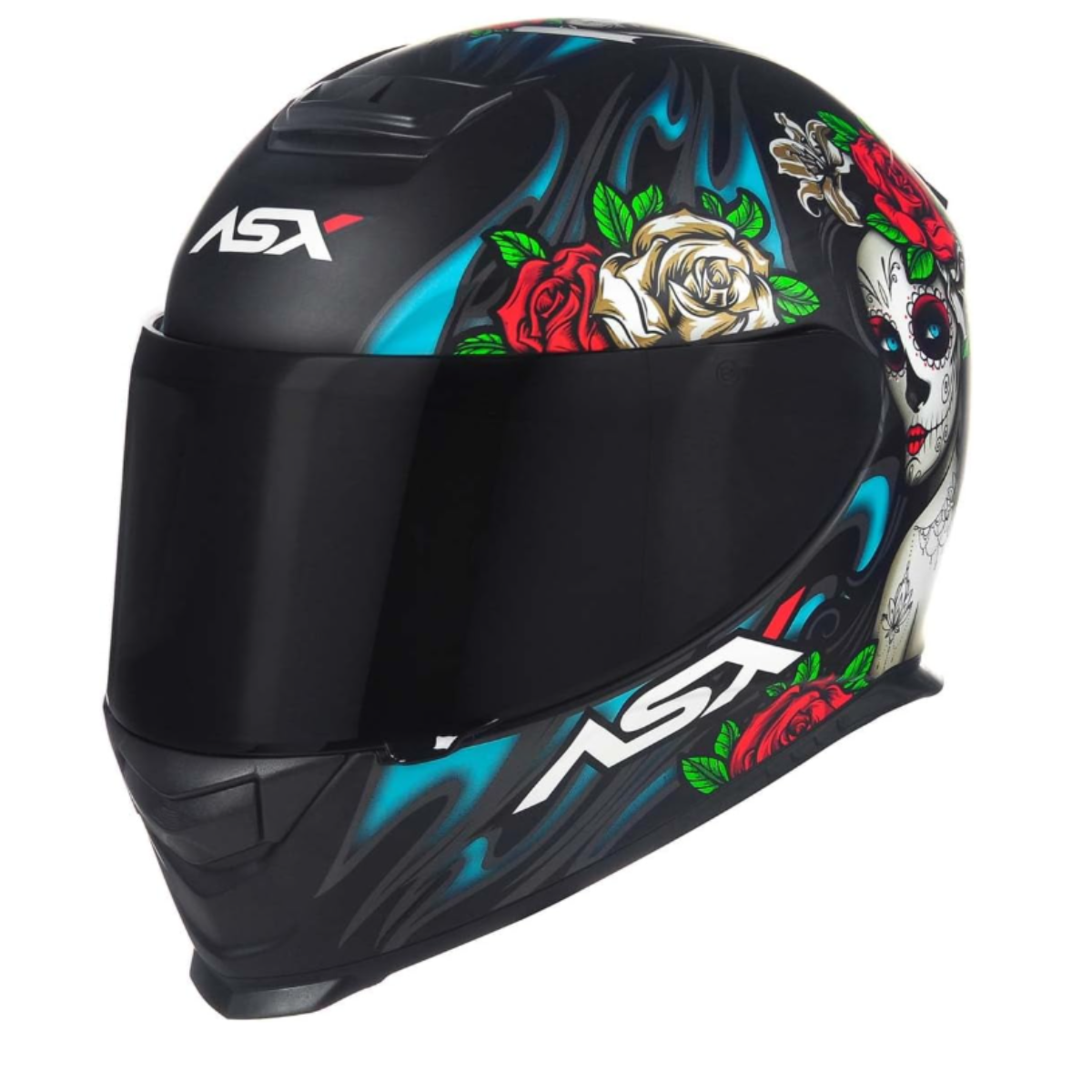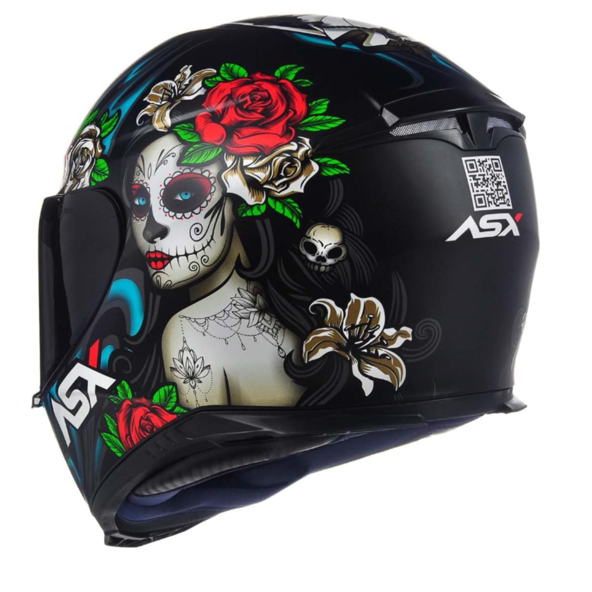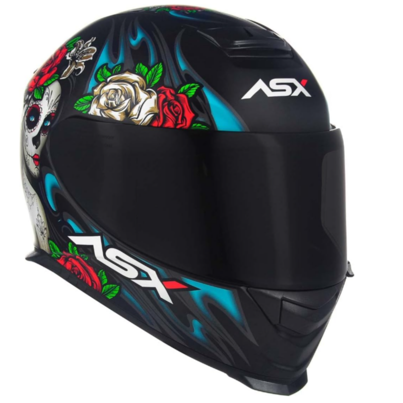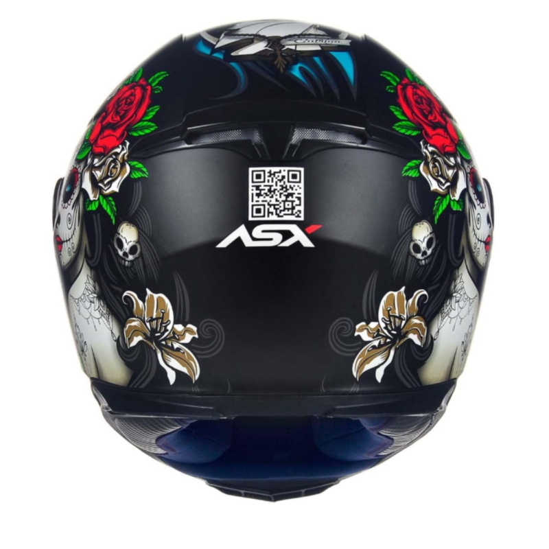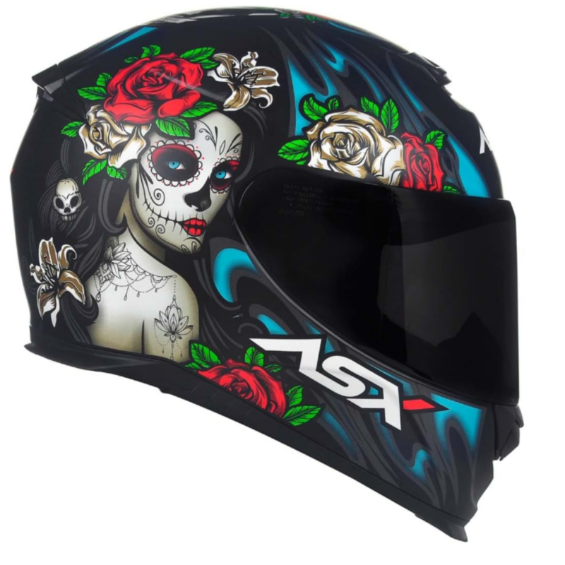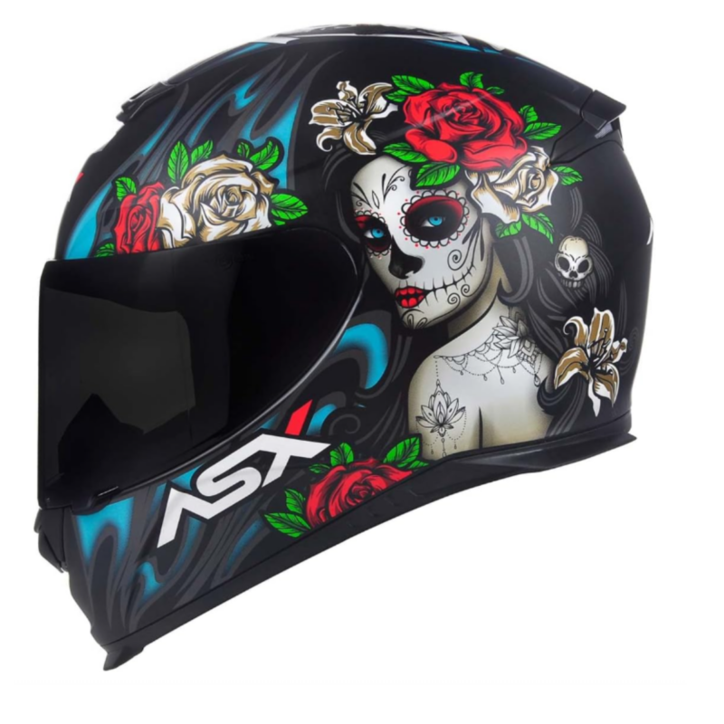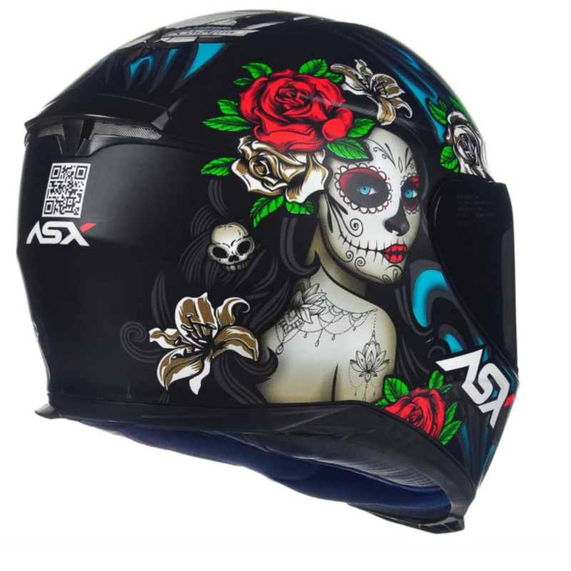 Com um visual inspirado na tradicional “La Catrina” da cultura mexicana, ele apresenta grafismos de caveiras ornamentadas e rosas, em cores vibrantes como azul e vermelho que contrastam com o fundo preto fosco. Essa combinação traz um charme dramático e ao mesmo tempo moderno, ideal para quem quer um capacete que se destaque no trânsito.